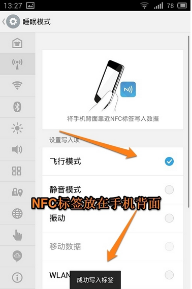 2、比如我們打開睡眠模式,將手機設置為飛行模式,如果你有其他的偏好,也可以自行修改添加。設置好之后,手機背面掃描一下NFC標簽,就會提示“成功寫入標簽”的字樣了。